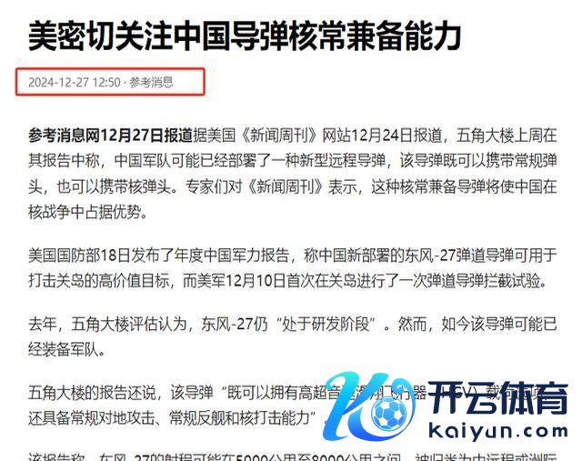 最近,好意思国五角大楼发布了一份文书,说中国的东风-27导弹一经列装队列了。