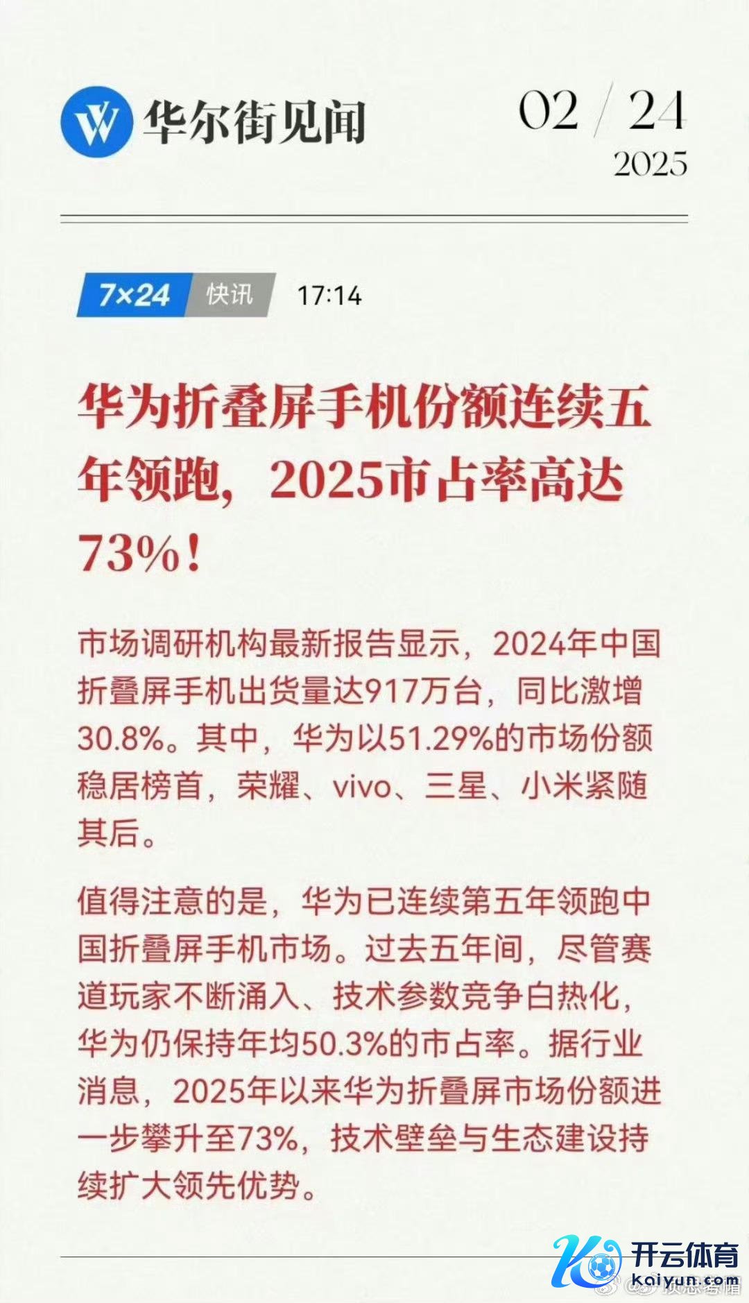 另一个好讯息是来自泰斗媒体“华尔街见闻”,他们报谈称华为在折叠屏手机界限流畅五年领跑。报谈称2024年中国折叠屏手机合座出货量达到917万台,同比增长30.8%。其中华为的市集份额高达到51.29%,流畅五年景为国内折叠屏市集的王者。名次华为之后的品牌划分是、vivo、三星、小米。也等于讲在国内折叠屏手机界限华为是王人备的王者,占比都跨越一半以上。固然在以前五年的时代不休有折叠屏手机玩家出现,但他们都没能撼动华为在这一界限地位,何况成为华为的烘托。